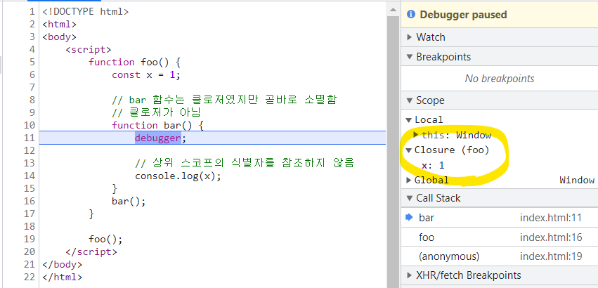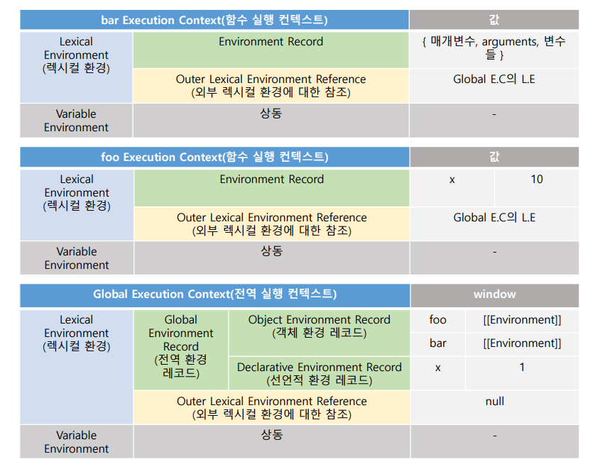 - foo 함수와 bar 함수는 모두 전역에서 정의된 함수이기 때문에 상위 스코프는 전역임