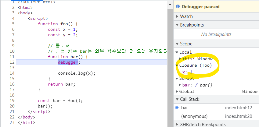 - 클로저란 함수가 자유 변수에 대해 닫혀있다라는 의미임(자유 변수에 묶여있는 함수)